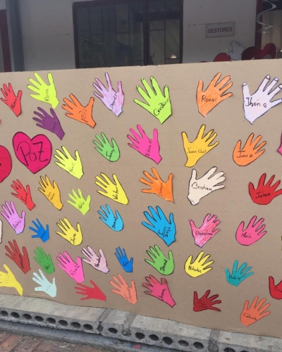 por eso unimos todas nuestras manos con los nombres de nuestros niños para hacer parte de la iniciativa de COTA conociendo la importancia de incentivar la PAZ, teniendo claro que el origen de ella son ellos.